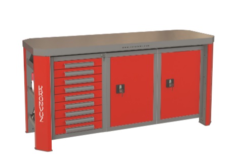ГЕФЕСТ-ВС-911 верстак слесарный в гараж. Столешница гнуто-сварная, толщина листа стали  3 мм. Рабочая поверхность: 1740 х 600 мм, высота 850 мм. Верстак с тремя тумбами, 1 секция: 9 ящиков, 2 секция: с дверцей, 3 секция: с дверцей.